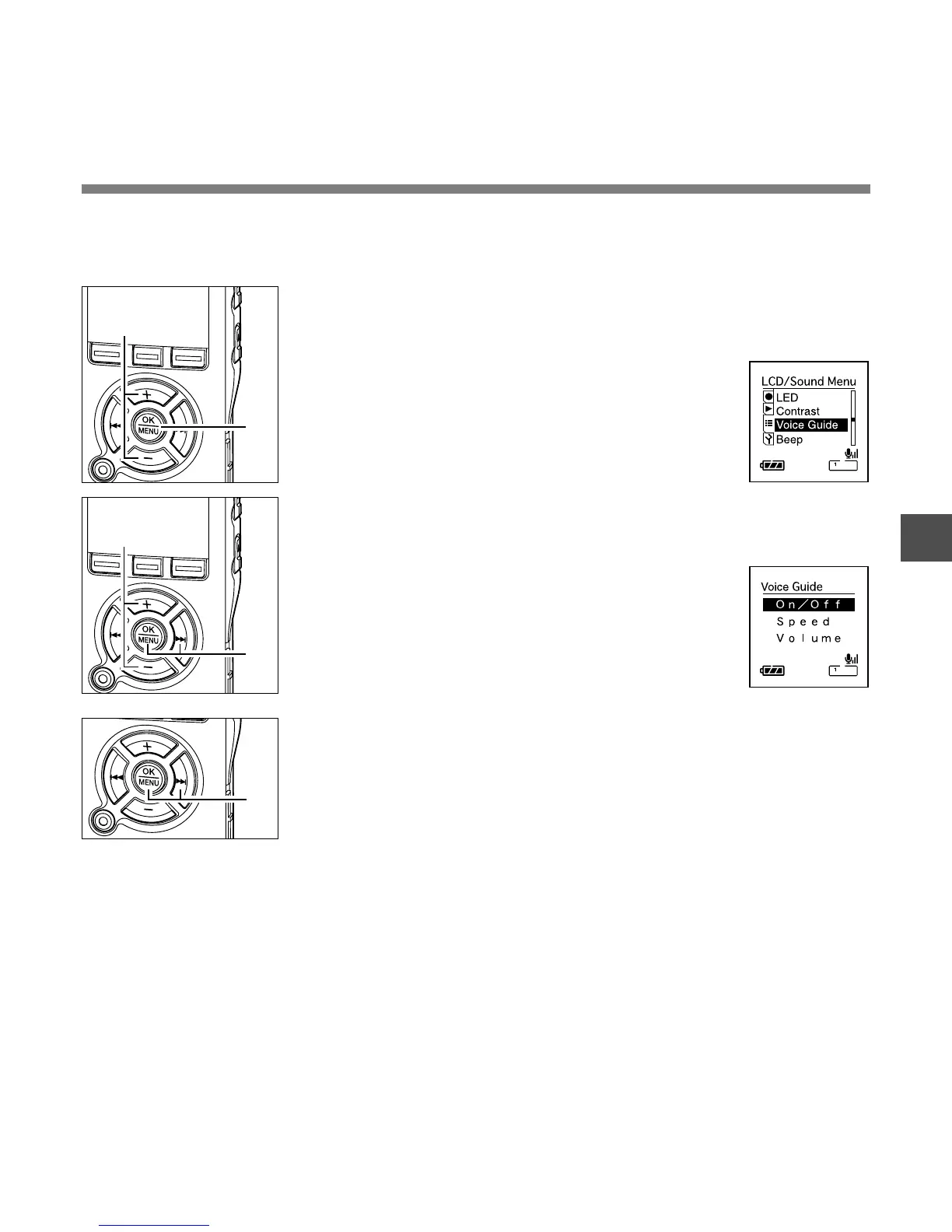 This feature gives audio announcements of recorder operating conditions. Adjust the speed