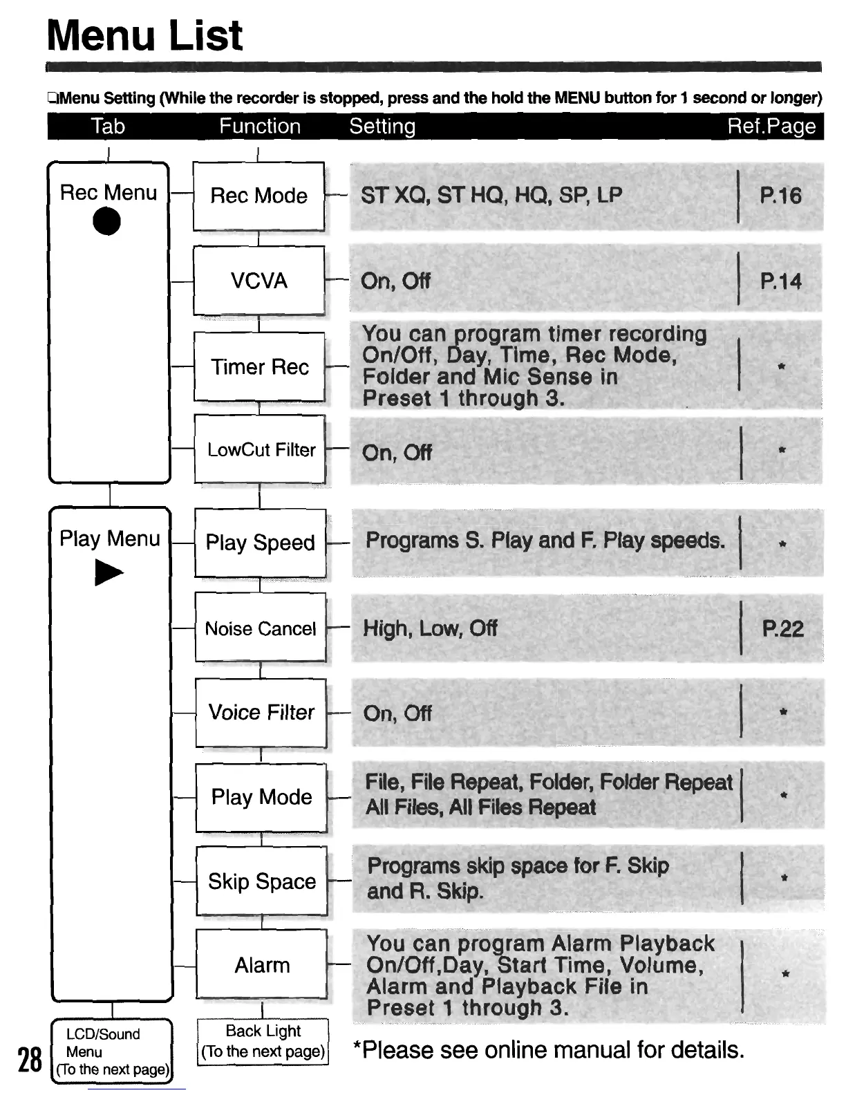 OMenu setting (While the recorder is stopped, press and the hold the MENU button