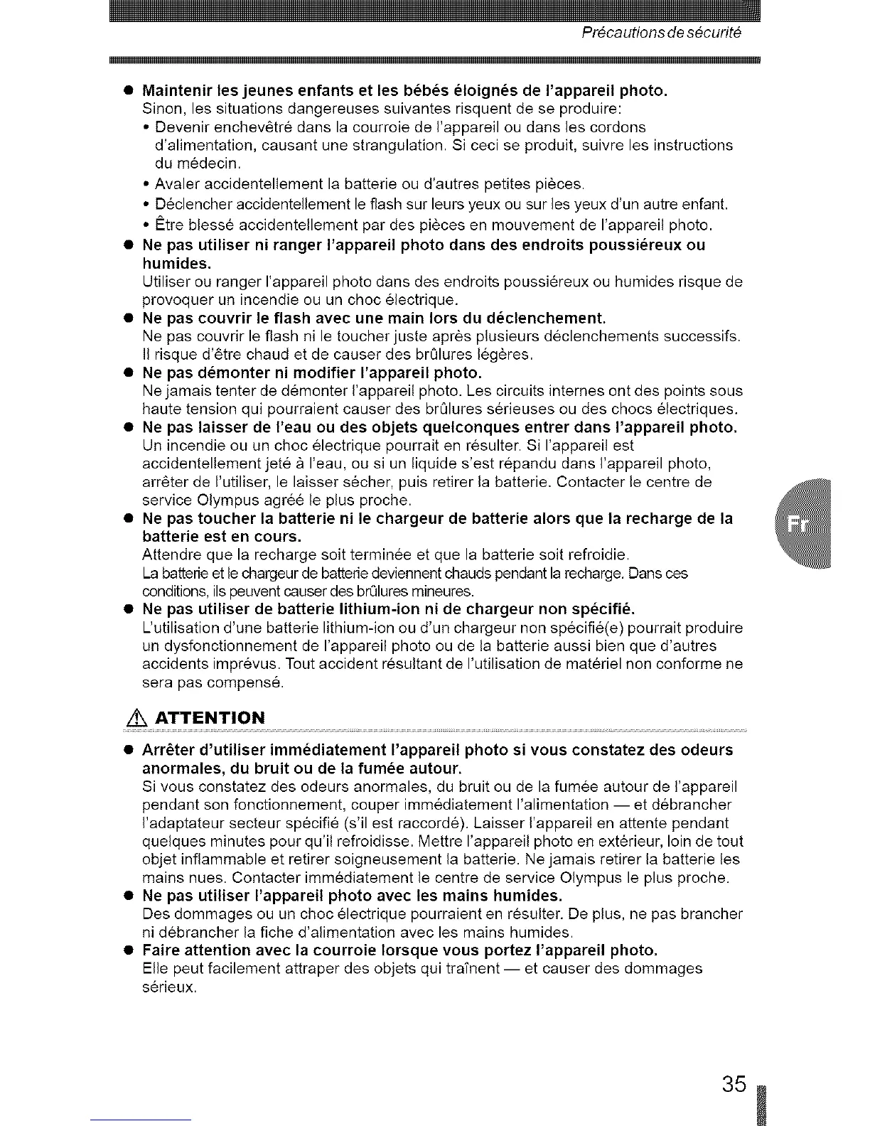 • Arr_ter d'utiliser imm_diatement I'appareil photo si vous constatez des odeurs