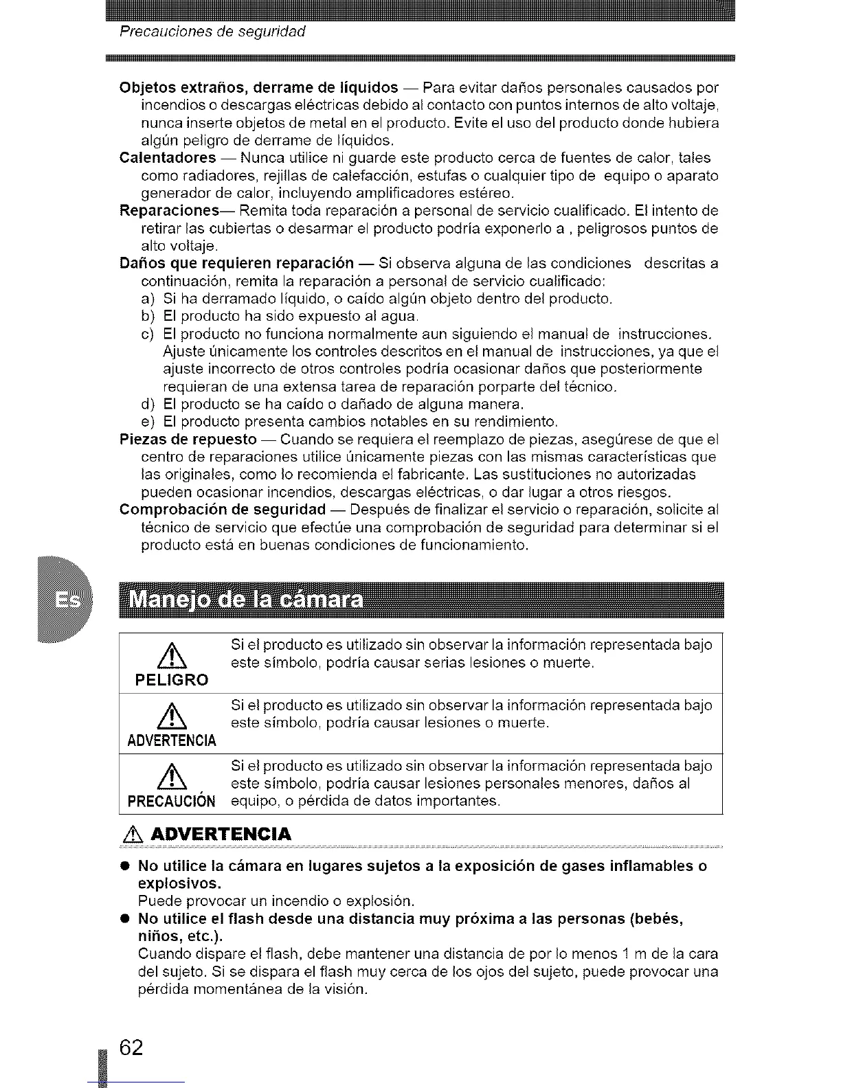 • No utilice la camara en lugares sujetos a la exposici6n de gases inflamables o