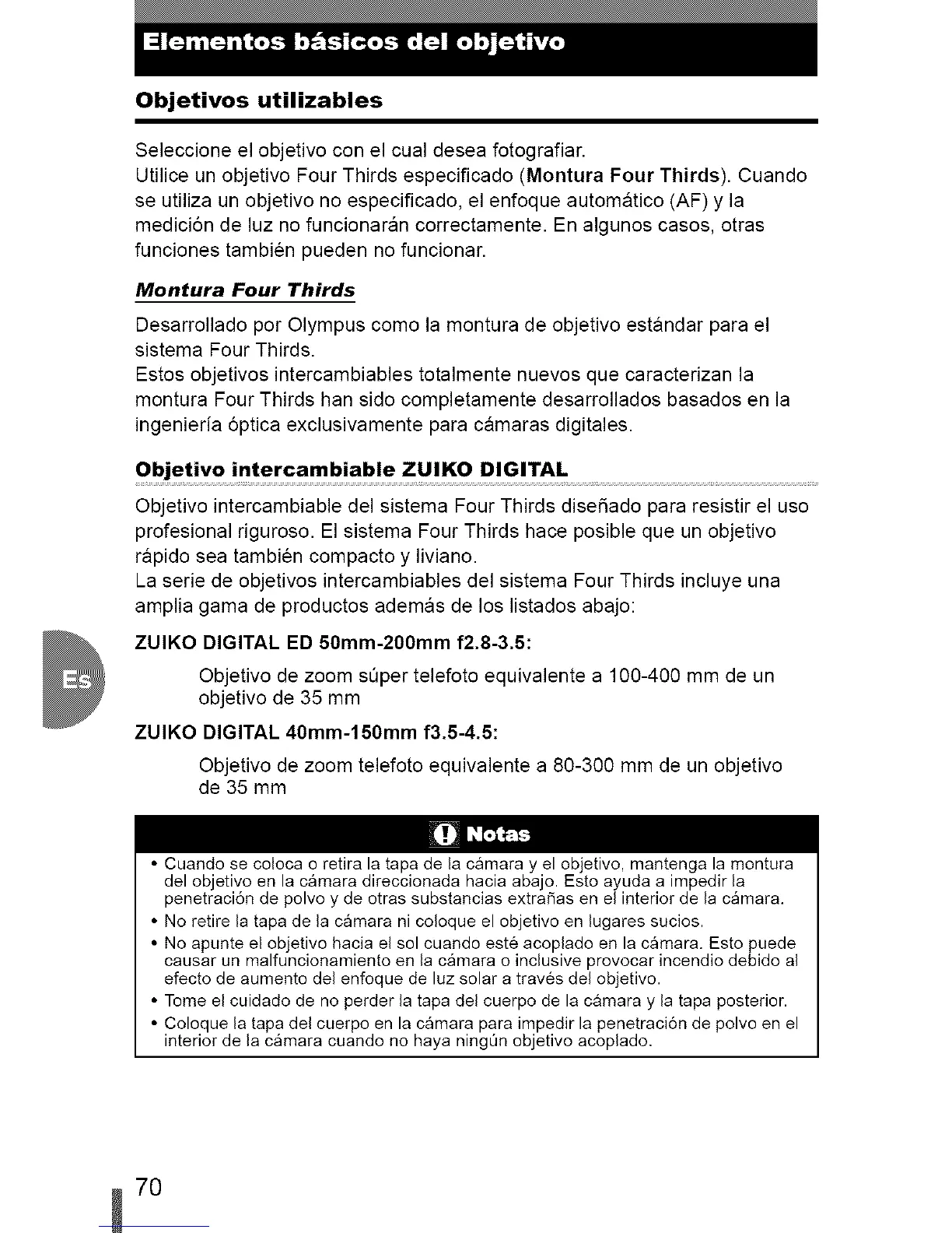 Utilice un objetivo Four Thirds especificado (Montura Four Thirds). Cuando