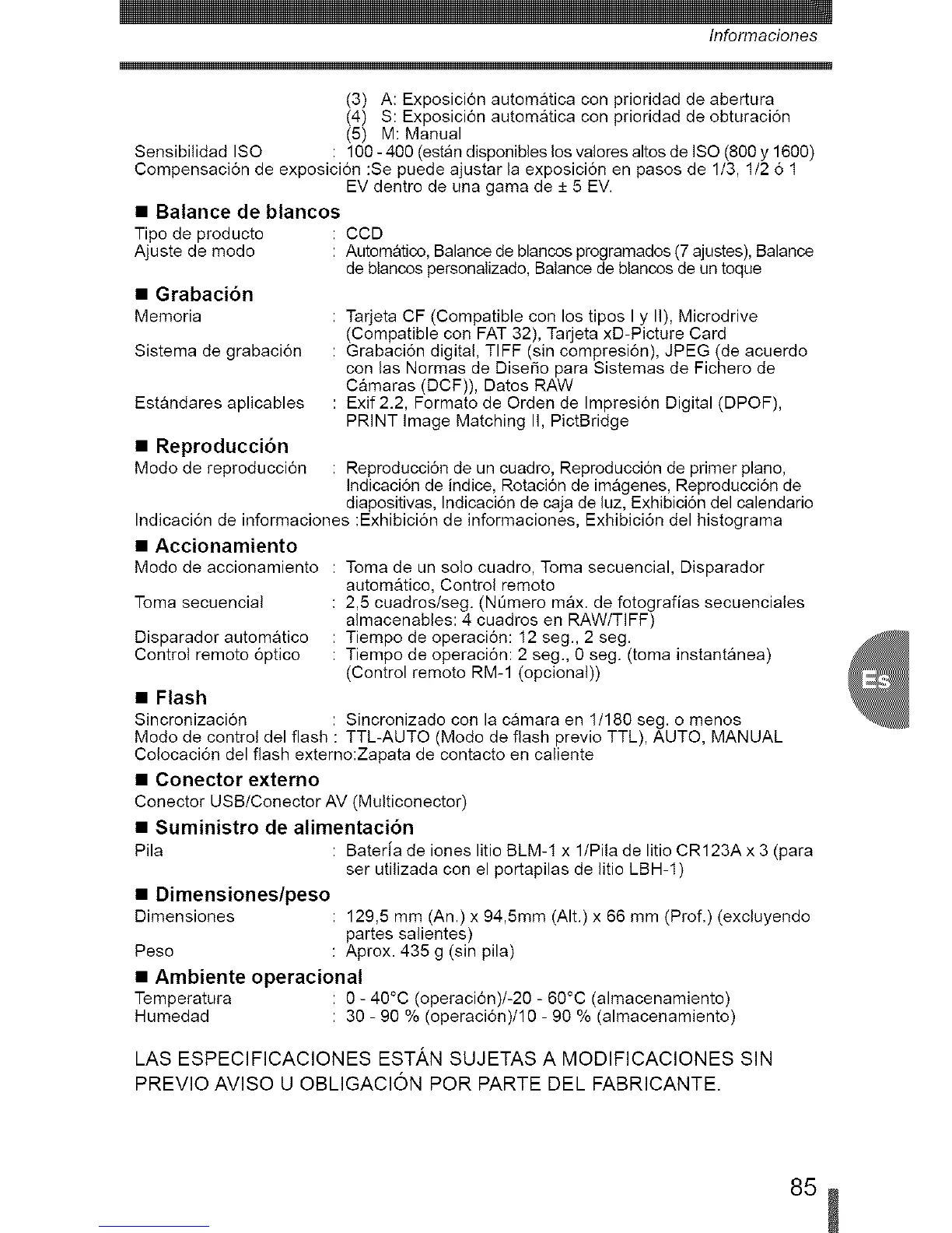 Sensibilidad ISO : 100-400(estandisponibleslosva!oresaltosdelSO(800y 1600)