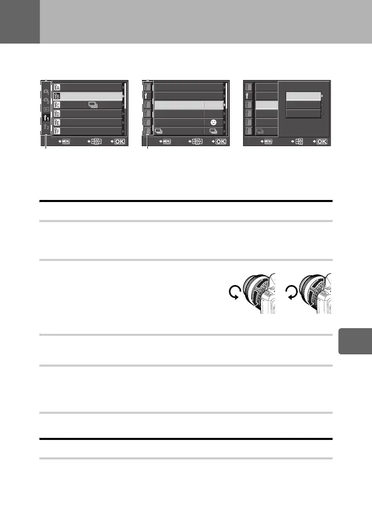 For details on using the menu lists, see “Using the menu” (gP. 29).