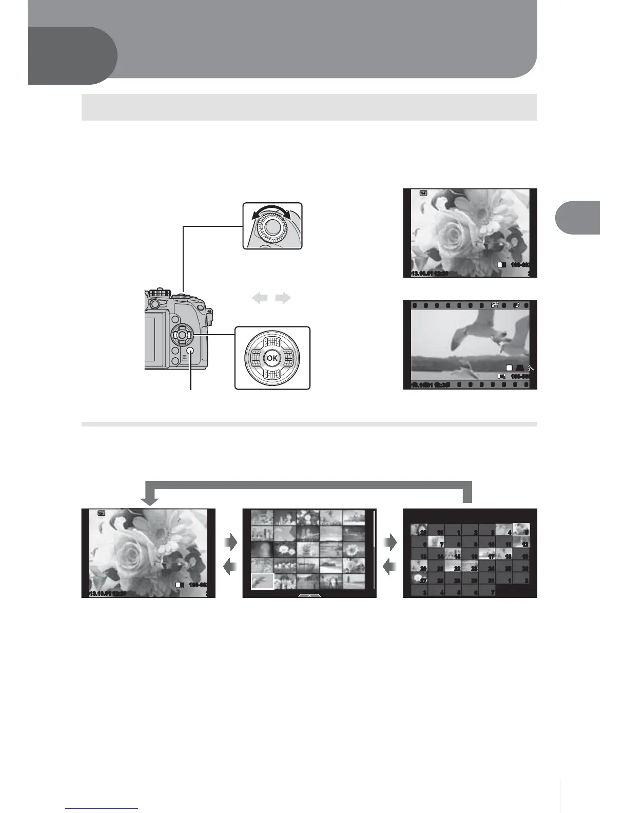 • To start index playback, turn the rear dial to G during single-frame playback. To start
