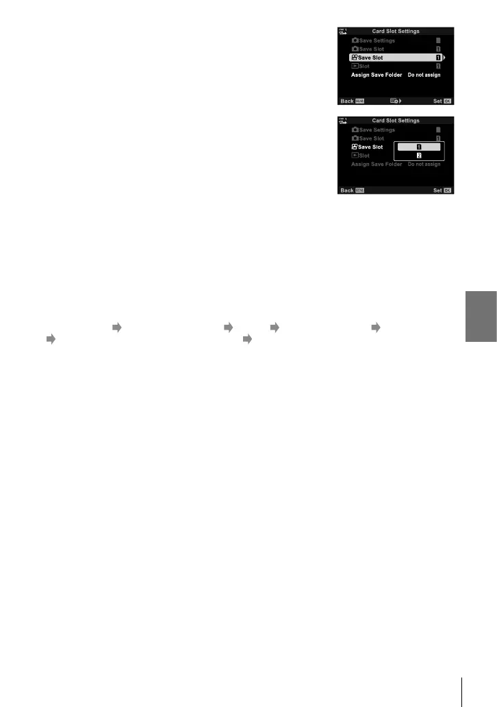 MENU button G (custom menu) tab Y tab [Card Slot Settings] [n Save Slot]