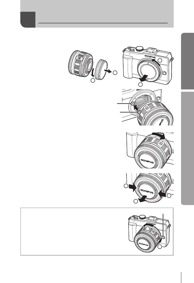 Remova a tampa da câmara e a tampa traseira da objectiva.