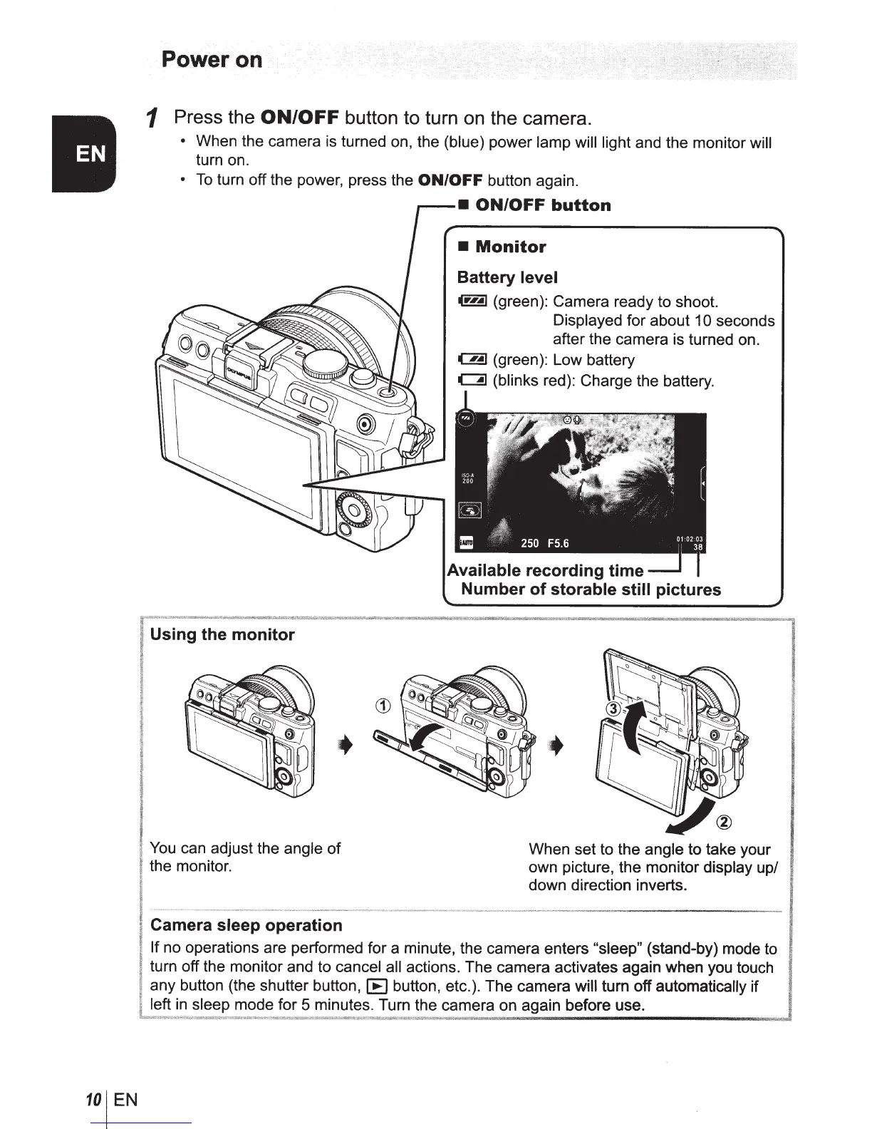 sleep mode for 5 minutes. Turn the camera on again before use.