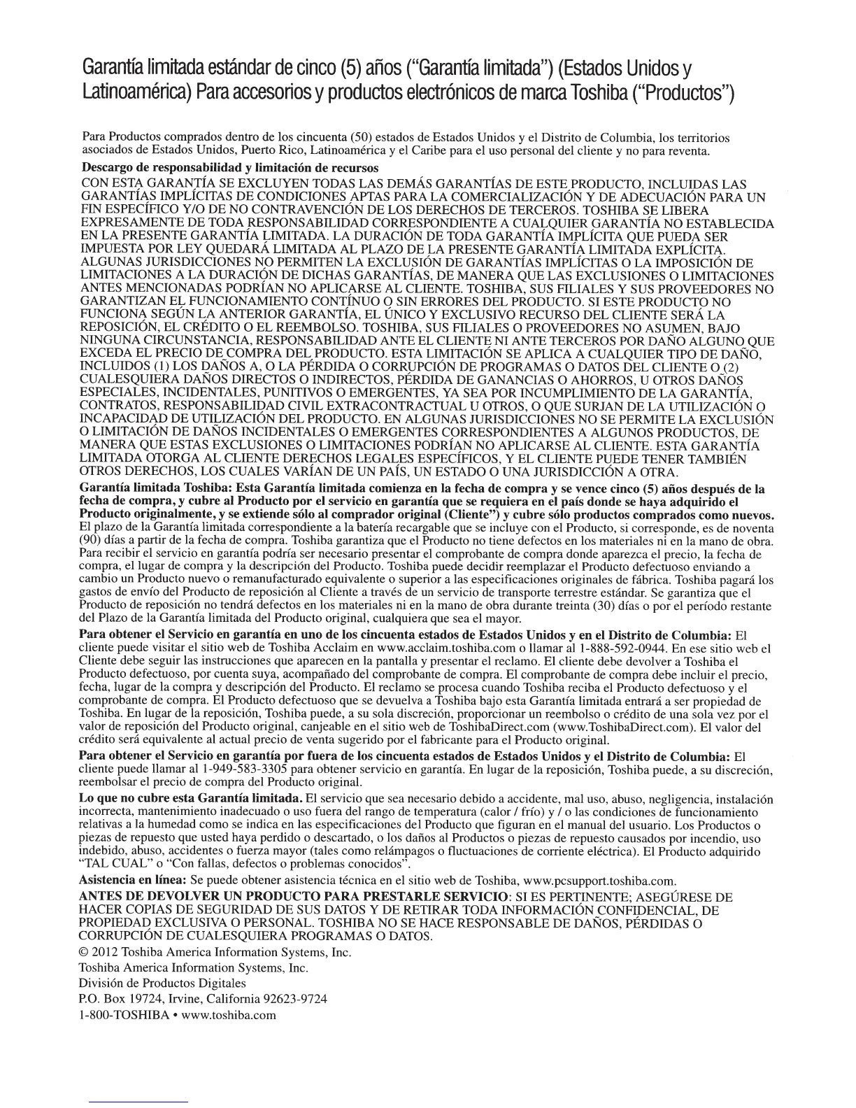 defectuoso que se devuelva a Toshiba bajo esta Garantfa limitada