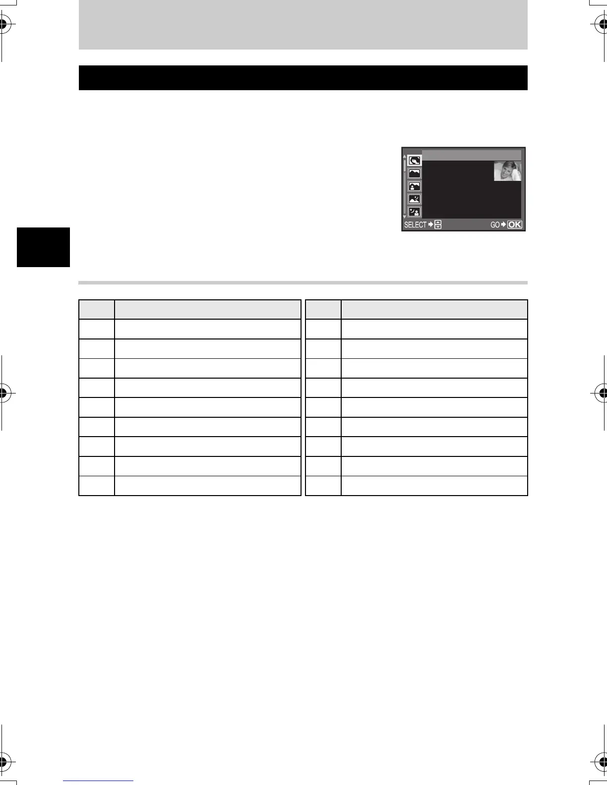 the shooting conditions. Unlike the mode dial’s scene mode, most functions cannot be