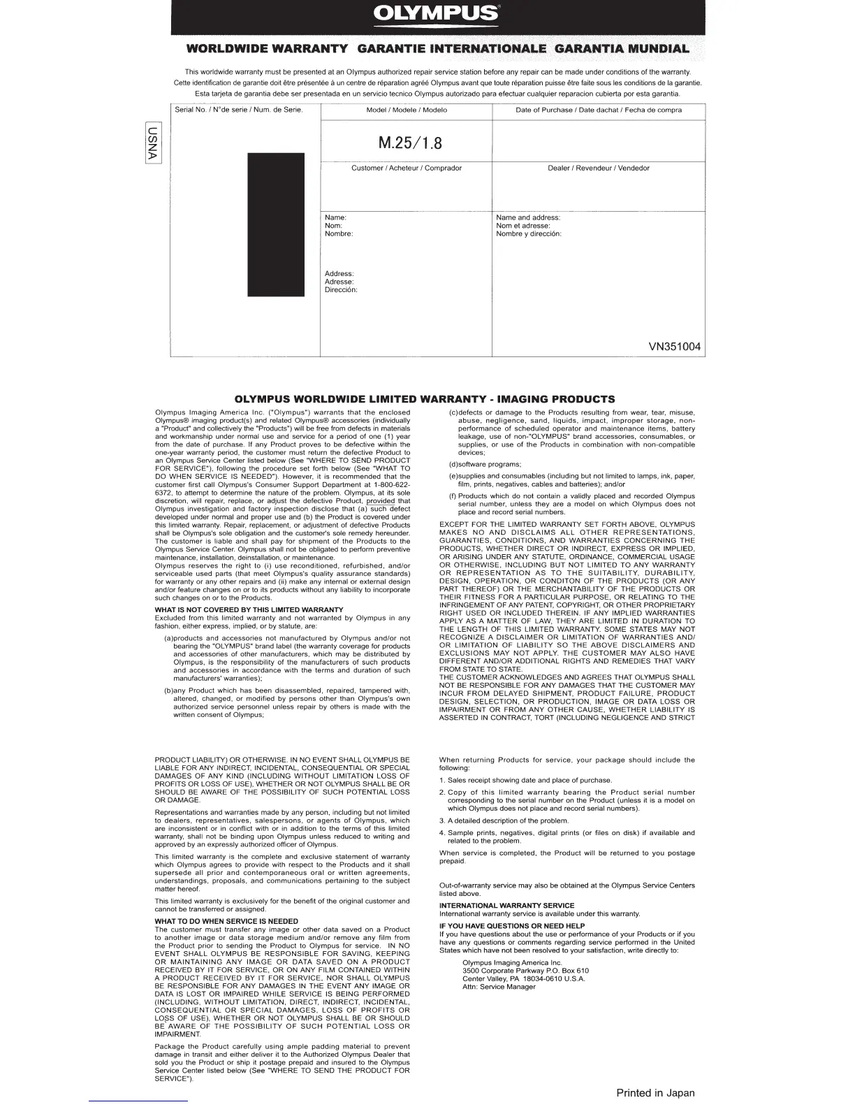 Esta tarjeta de garantia debe ser presentada en un servicio tecnico Olympus autorizado para efectuar cualquier reparacion cubierta por esta garantia.