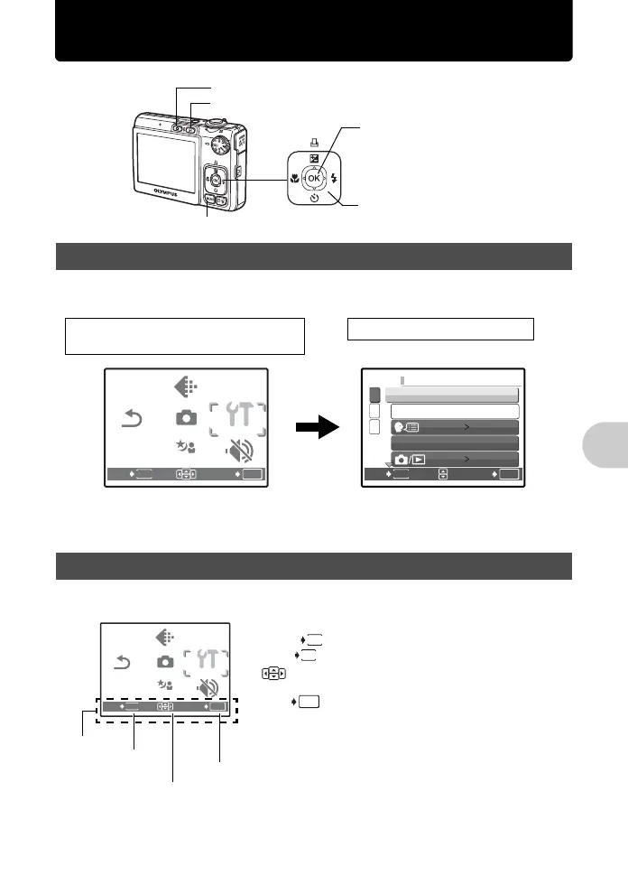 Au cours de l’utilisation des menus, les touches et leurs fonctions respectives sont affichés dans la partie