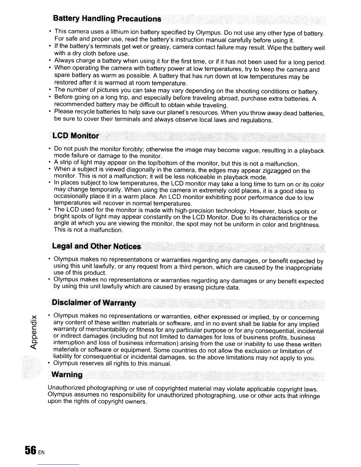 Olympus assumes no responsibility for unauthorized photographing, use or other acts that infringe