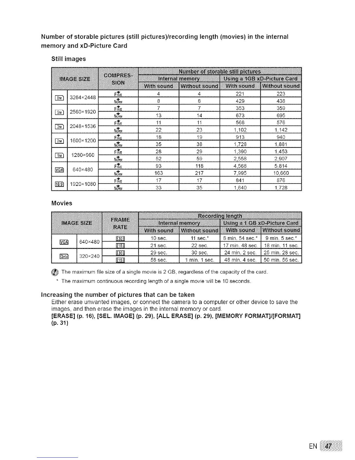 Numberofstorablepictures(stillpictures)/recordinglength(movies)in the internal