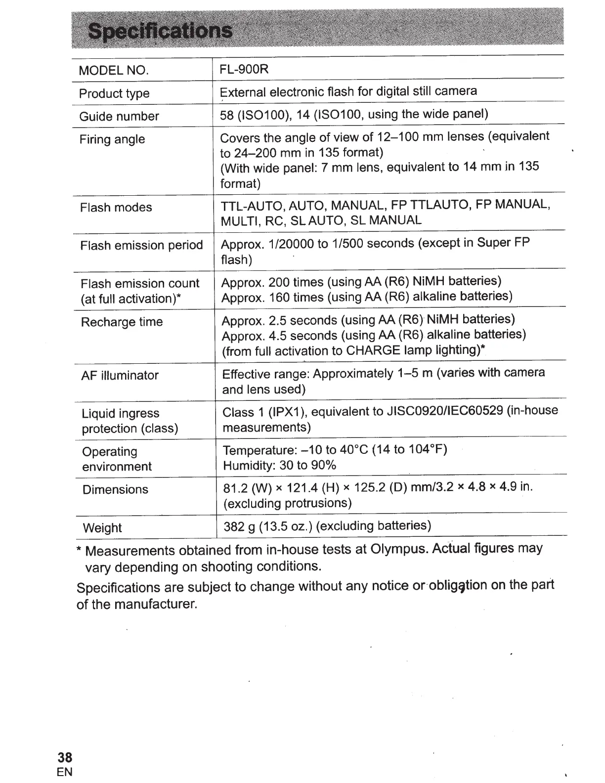 Measurements obtained from in-house tests at Olympus. Actual figures may