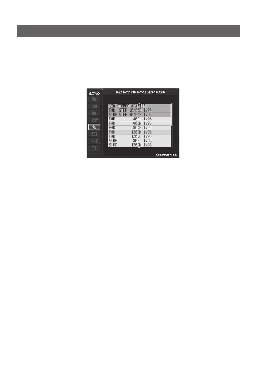 2 Select the registered stereo optical adapter, and press the [MEAS/ENTER] joy-