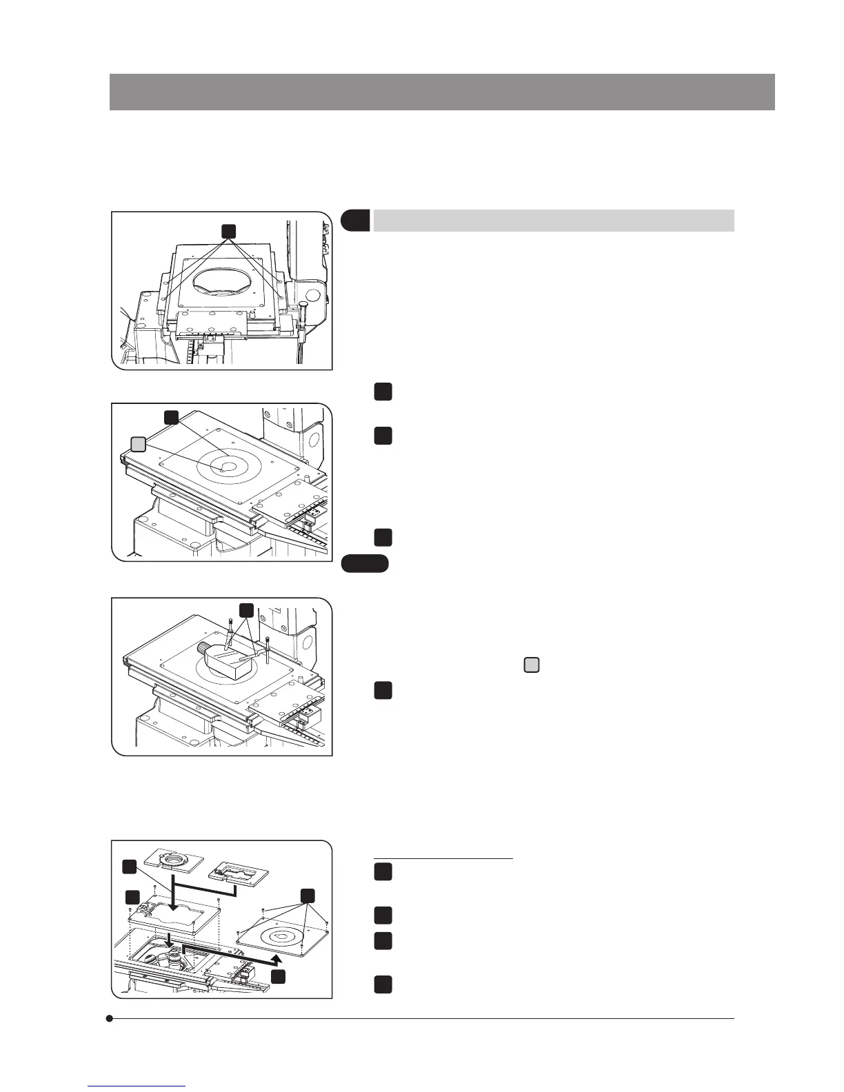 } When mounting the mechanical stage IX-MVR, attach first the plain