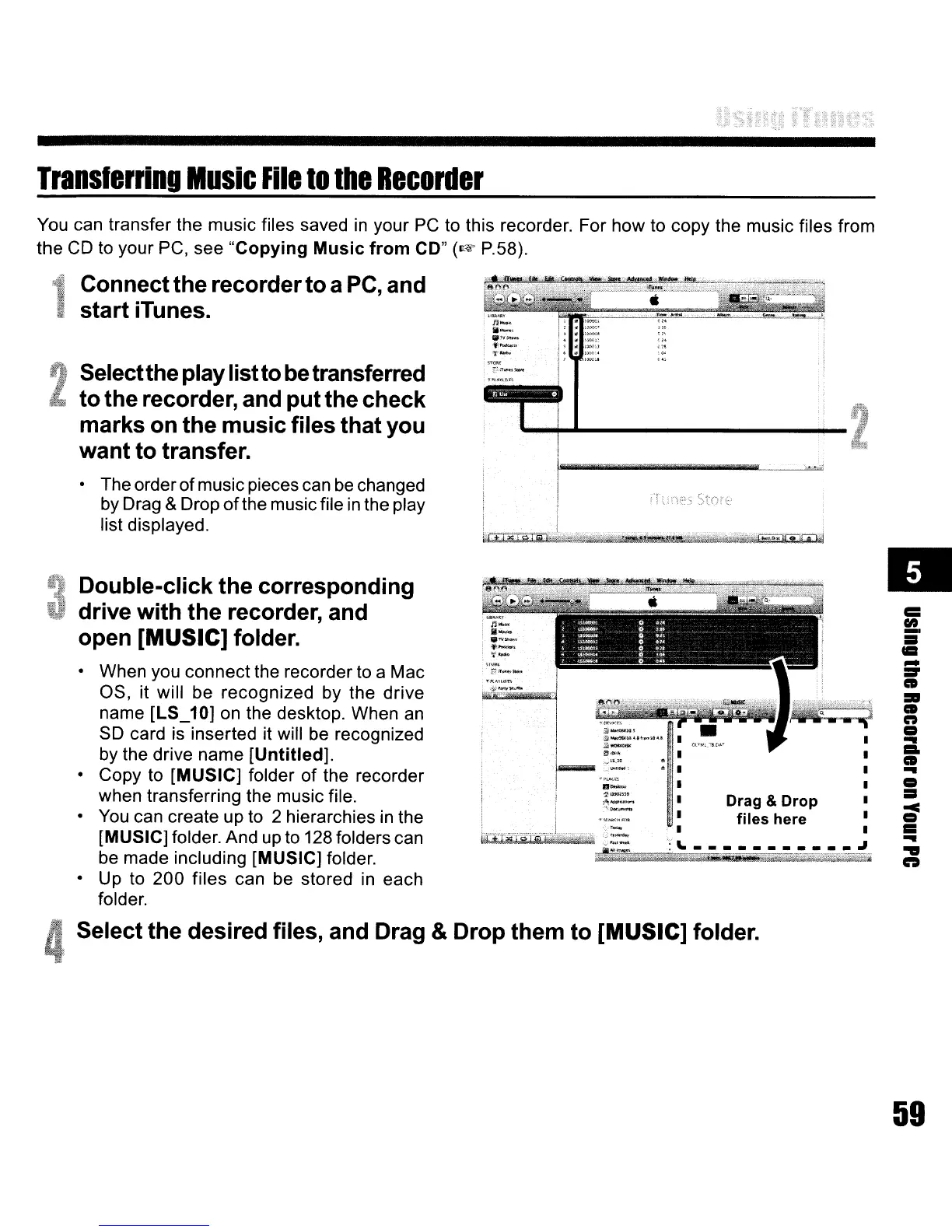 your PC to this recorder. For how to copy the music files from