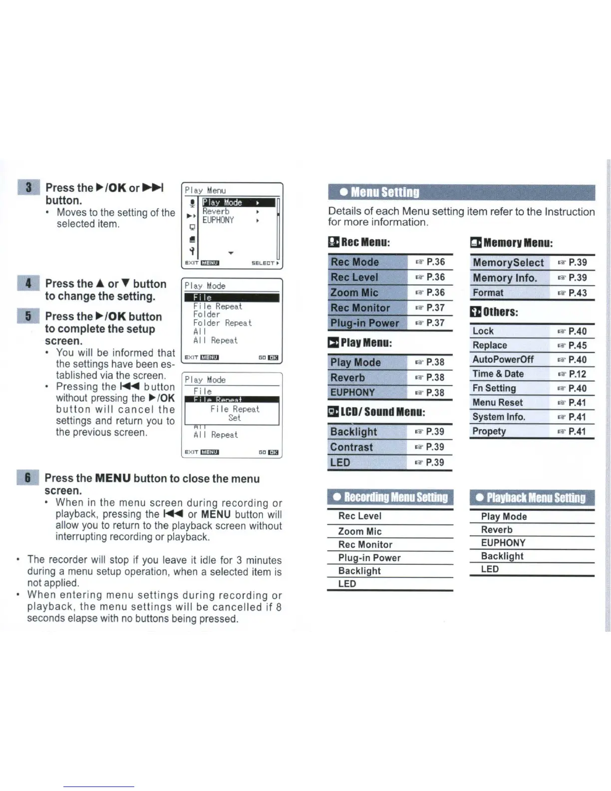 each Menu setting item refer to the Instruction
