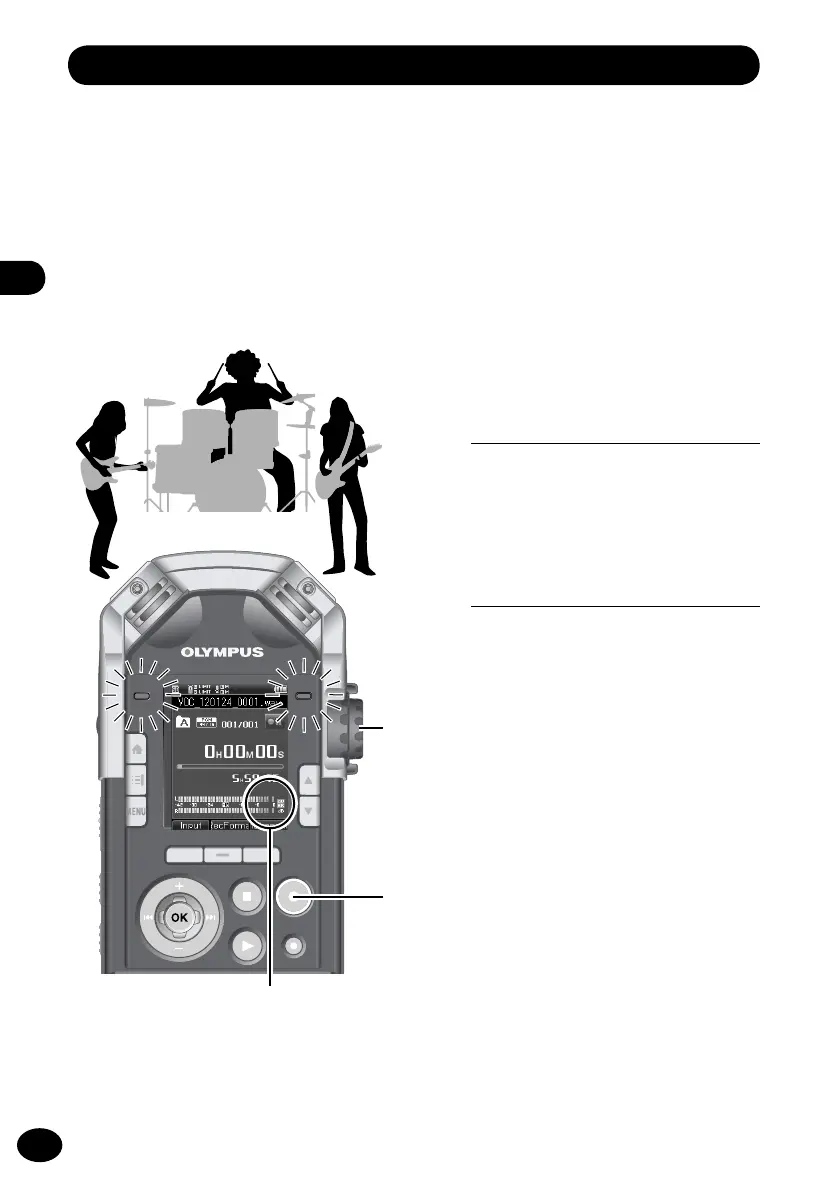 or the PEAK indicator (R) lights in orange. Adjust the recording level so that the recording level