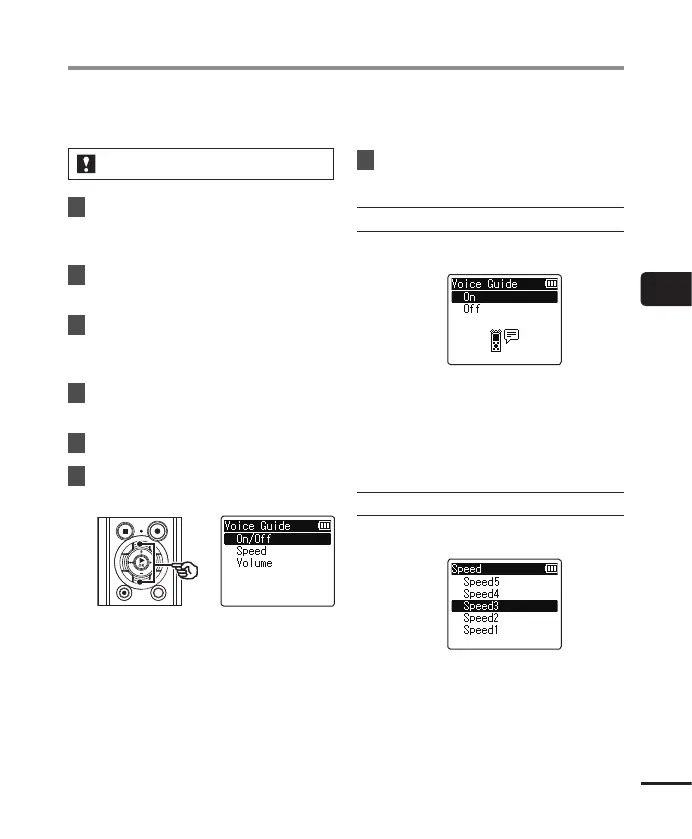 This feature gives voice announcements of recorder operating conditions. You can set voice