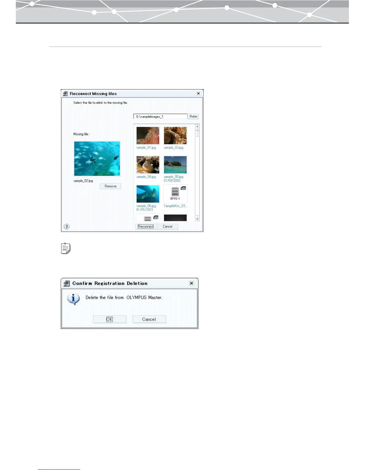 If you want to delete the missing file from the OLYMPUS Master database, click [Delete]. When the [Confirm