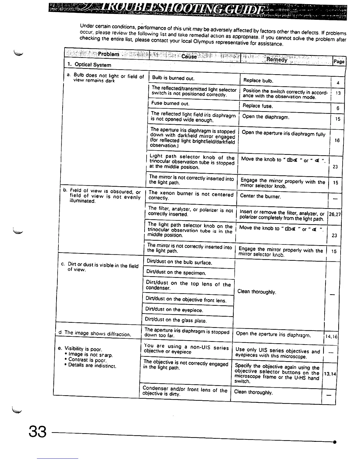 Olympus MX50A/T - Troubleshooting Guide for Common Problems; Troubleshooting Optical and Stage Issues