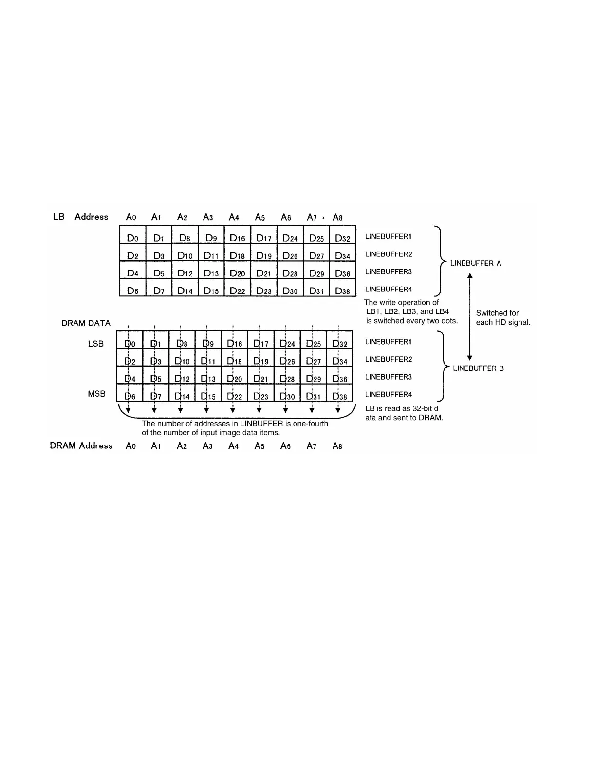 The eight-bit image data input to this circuit is stored in each line buffer in the order below.