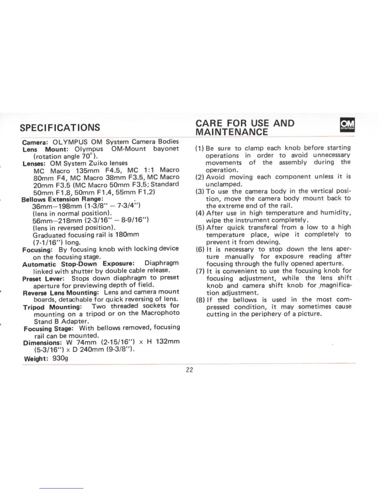 Olympus OM - SPECIFICATIONS; CARE FOR USE AND MAINTENANCE