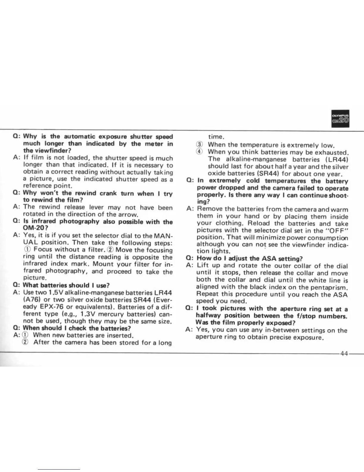 Olympus OM20 - Exposure Speed, Film Loading, and Infrared Photography; Battery Management and ASA Settings