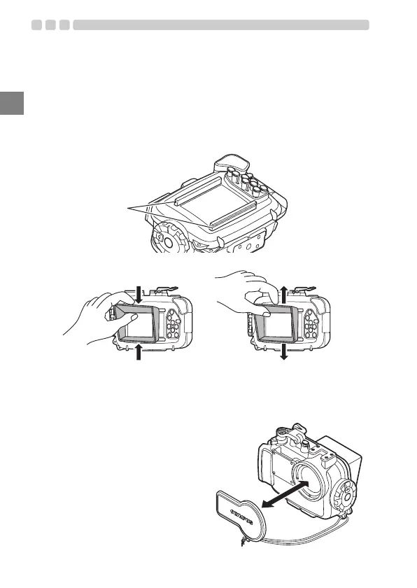 Fit the LCD hood as shown in the figure into the guides above and below