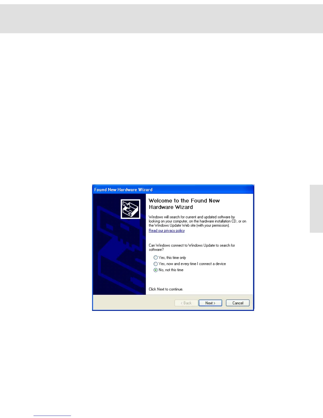 1) Windows XP opens the Found New Hardware Wizard dialog box.