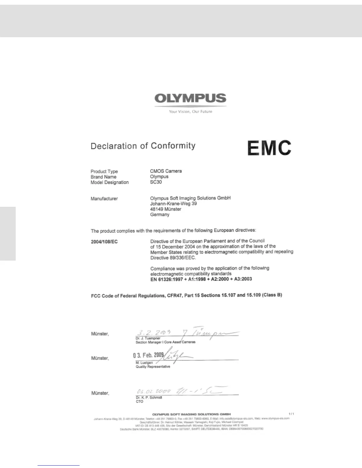 Olympus SC30 - Appendix V: EMC Declaration - SC30; Declaration of Conformity (EMC)