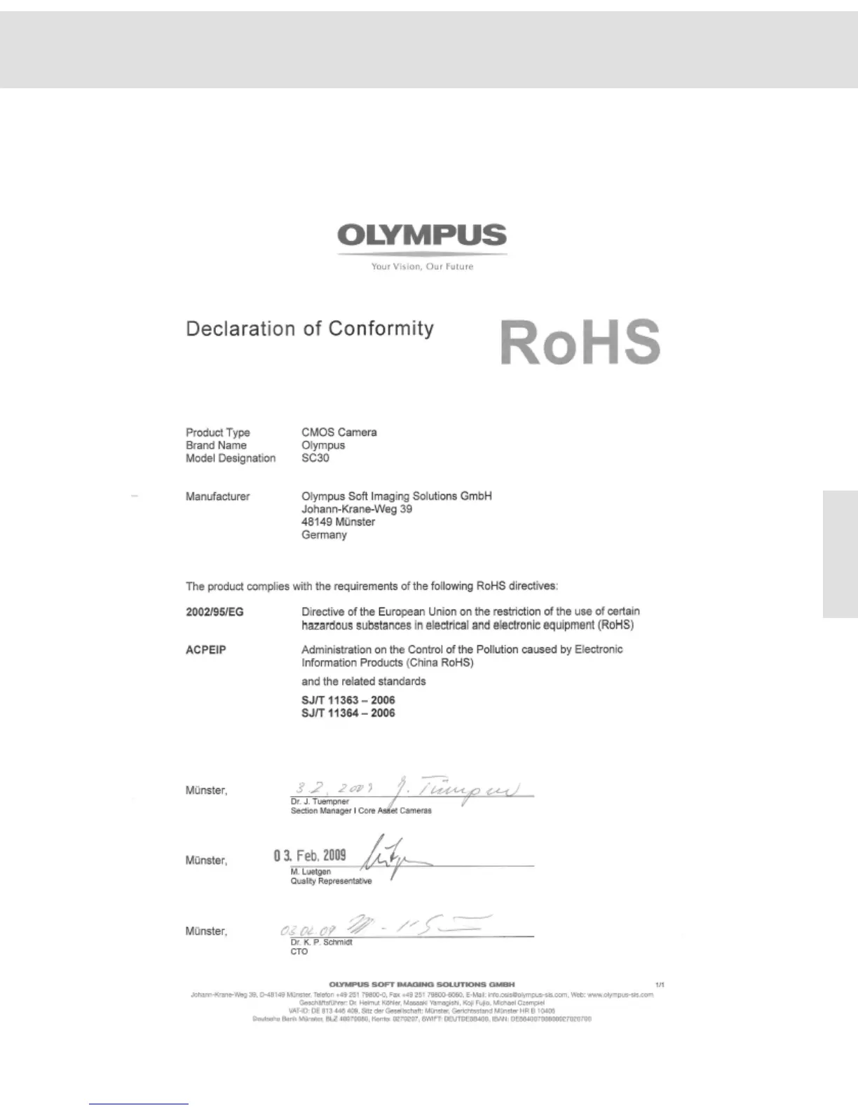 Olympus SC30 - Appendix VI: RoHS Declaration - SC30; Declaration of Conformity (RoHS)