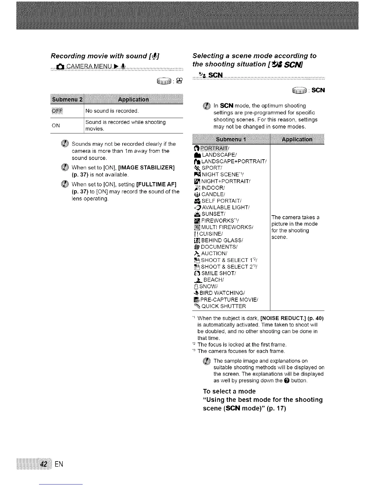 scene (SCN mode)" (p, 17)