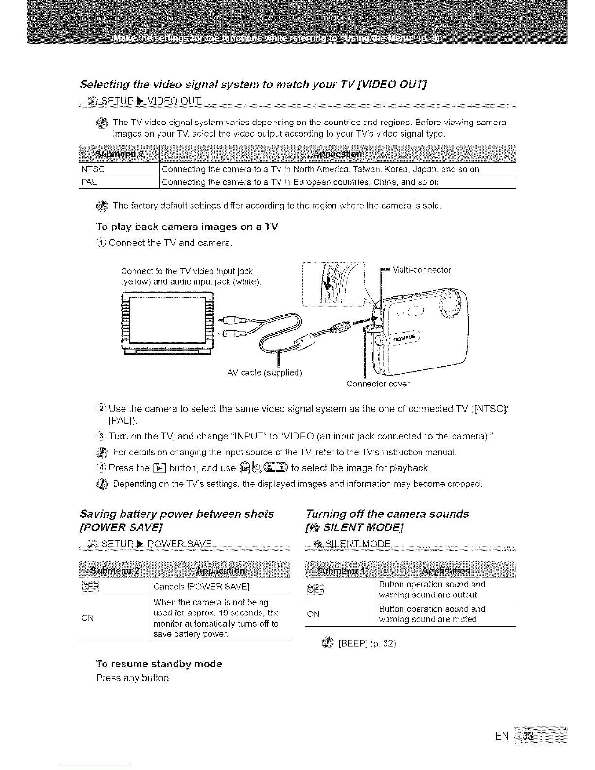 (_) Use the camera to select the same video signal system as the one of connected TV ([NTSC]/