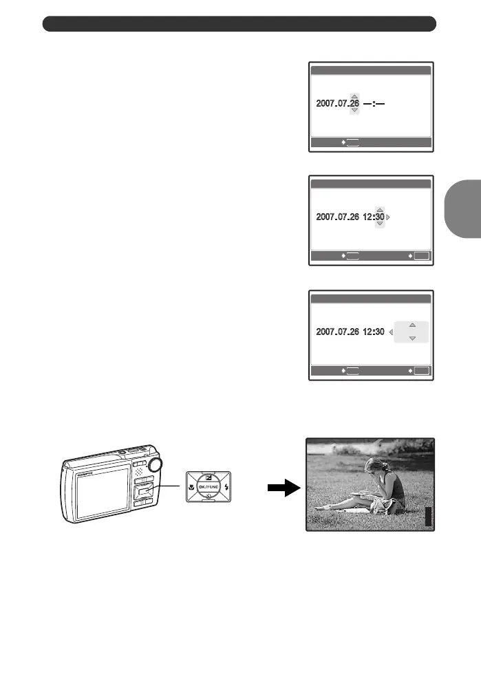 • For precise time setting, press the e button as the time signal strikes 00 seconds.