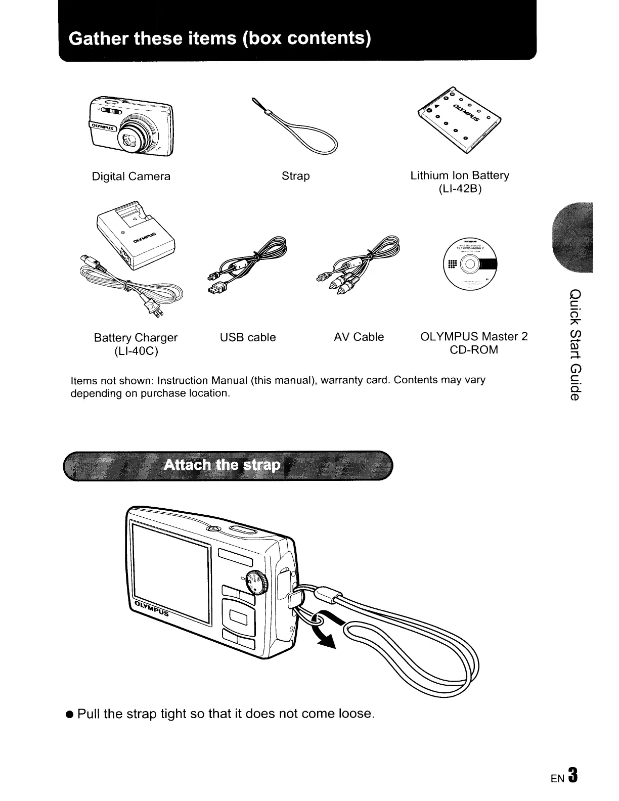 Olympus Stylus 840 - Quick Start Guide; Gather these items (box contents); Attach the strap