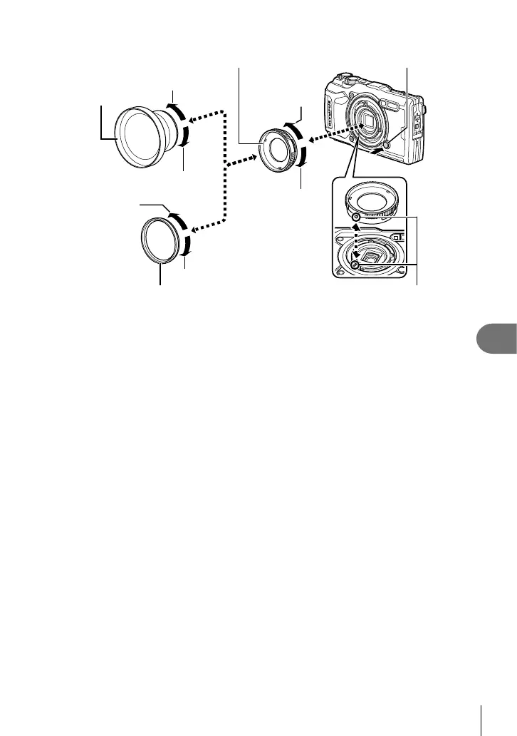 2) Rotate the lens or fi lter in the “attach” direction to screw it onto the adapter.