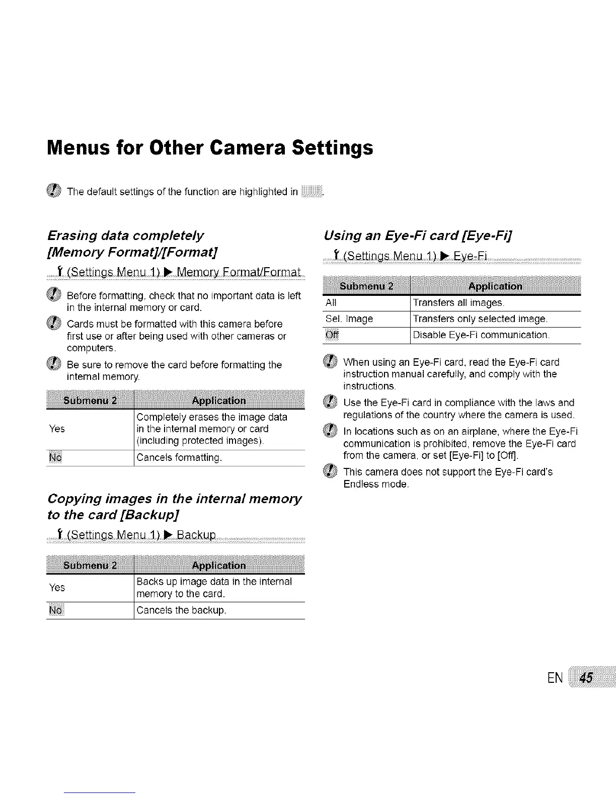 Menus for Other Camera Settings