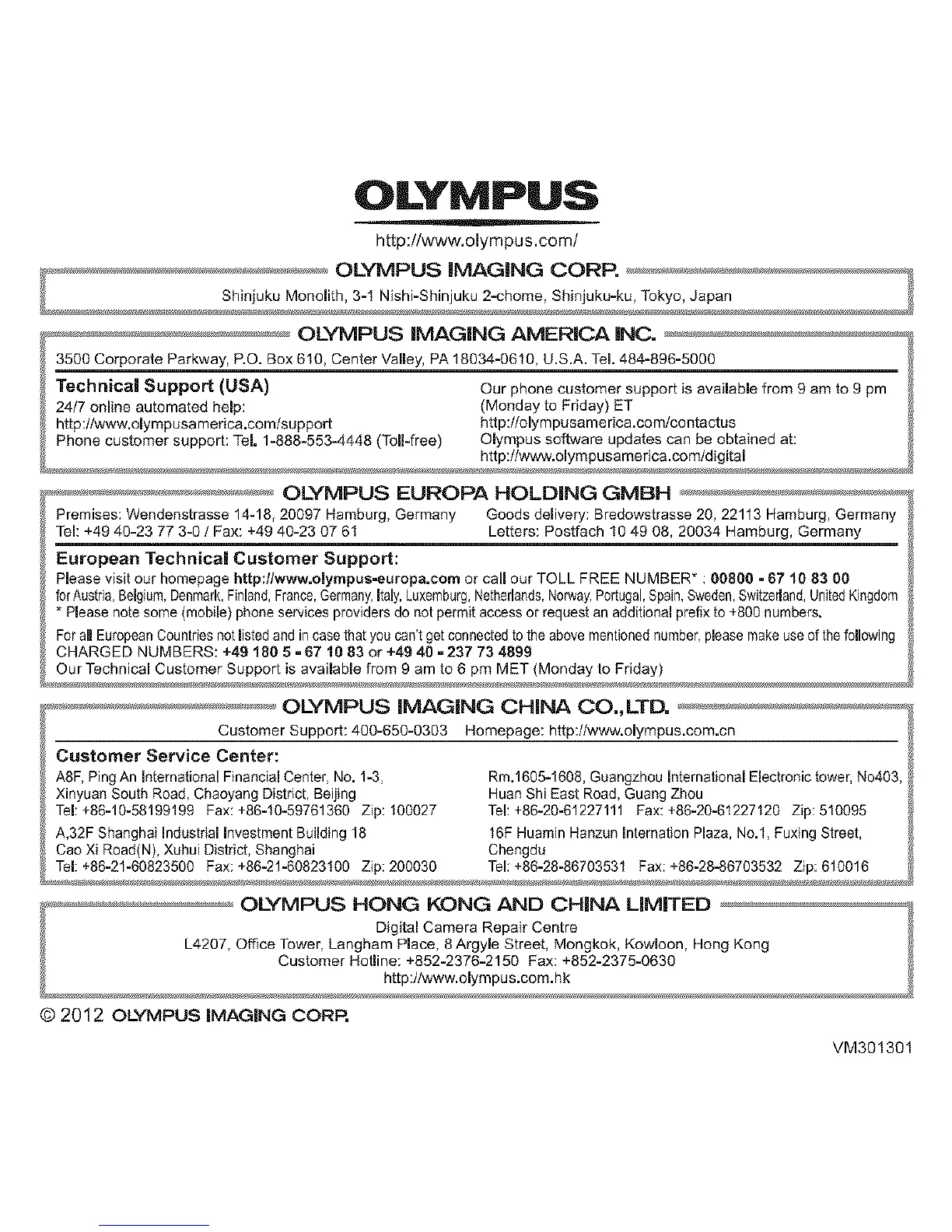 Customer Support: 400-650-0303 Homepage: http://www.olympus.com.cn