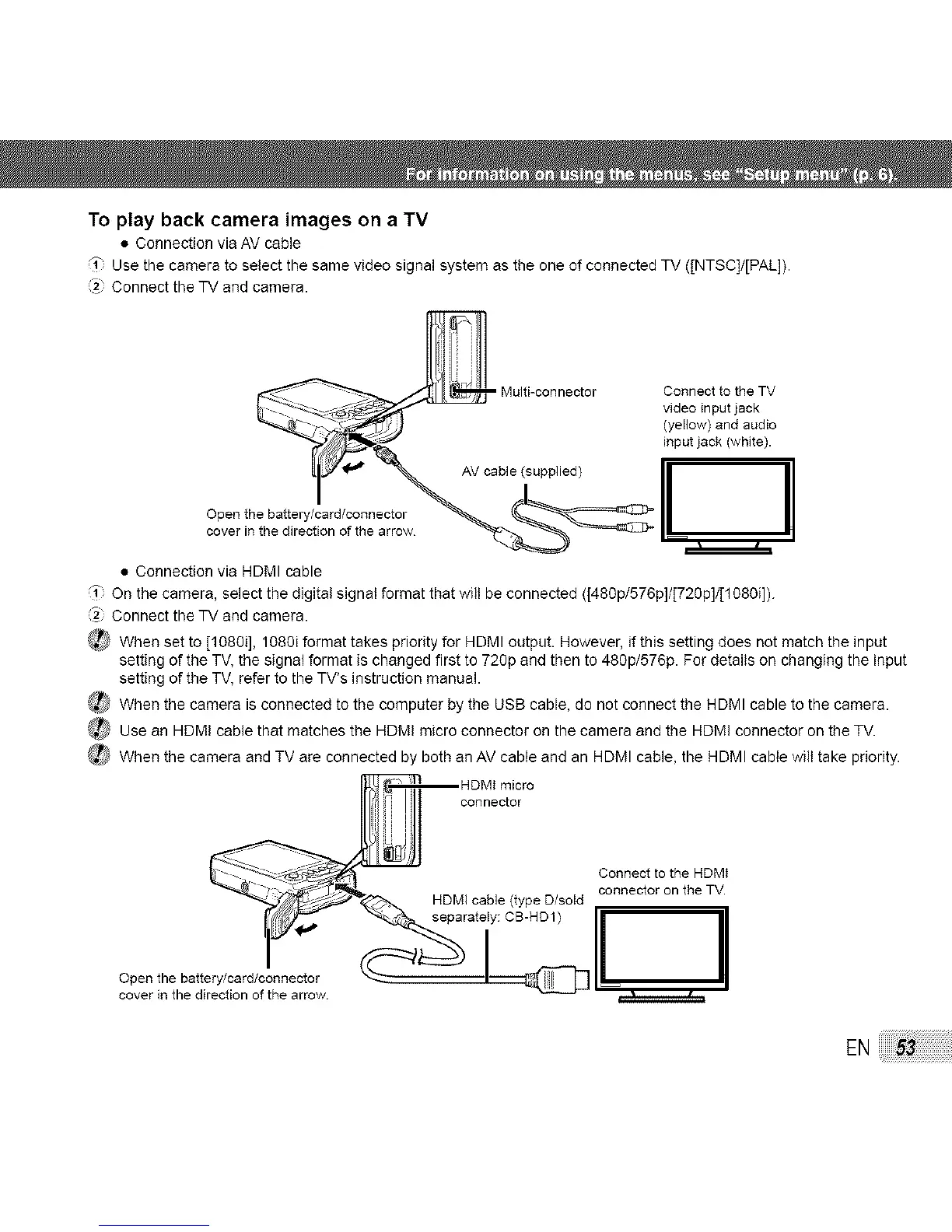 _ When the camera and TV are connected by both an AV cable and an HDMI cable, the HDMI cable will take priority.
