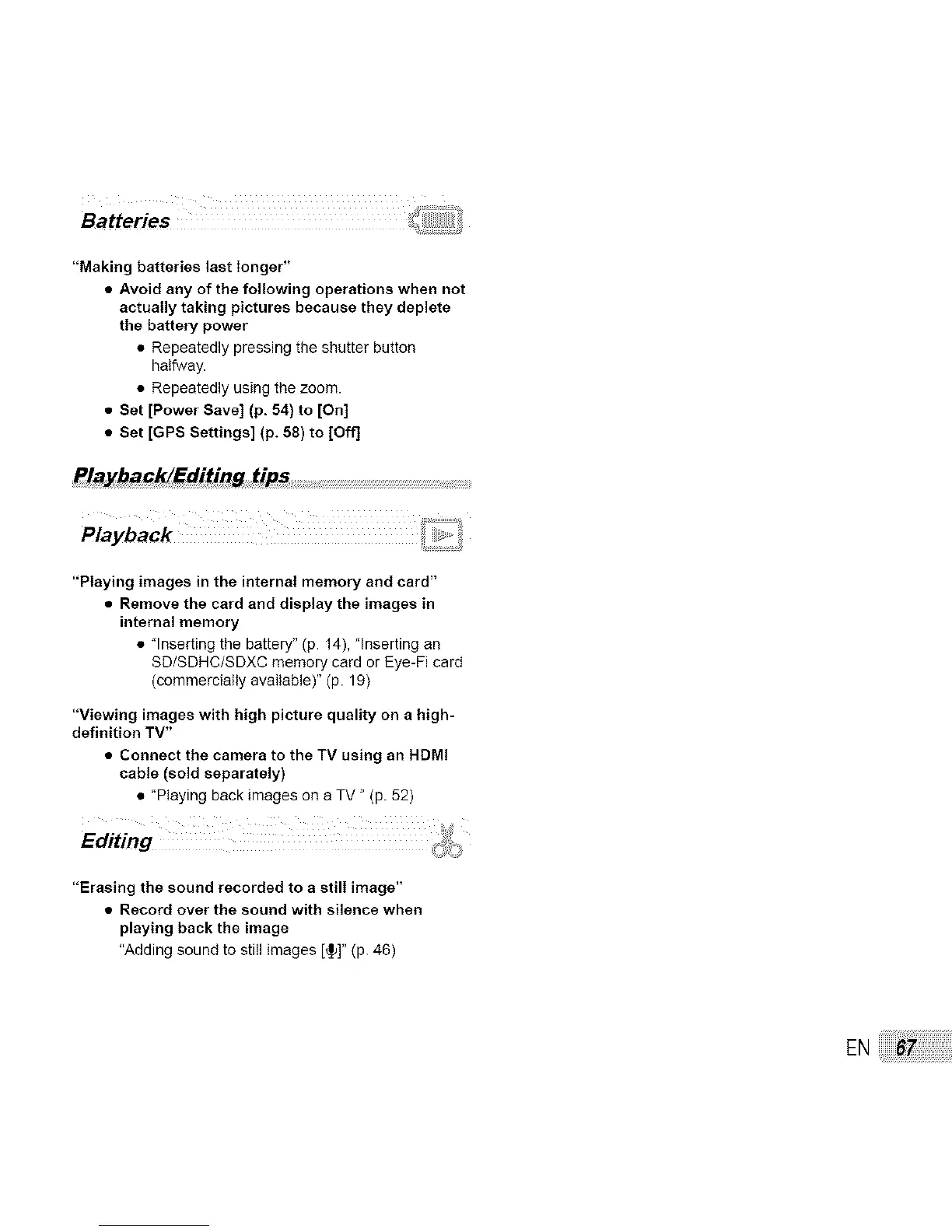 • "Playing back images on a TV" (p. 52)