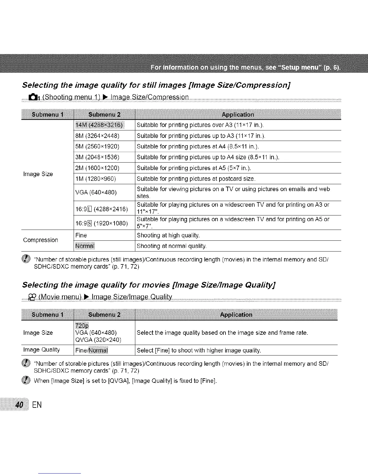 (_ 'Number of storable pictures (still images)/Continuous recording length (movies) in the internal memory and SD/