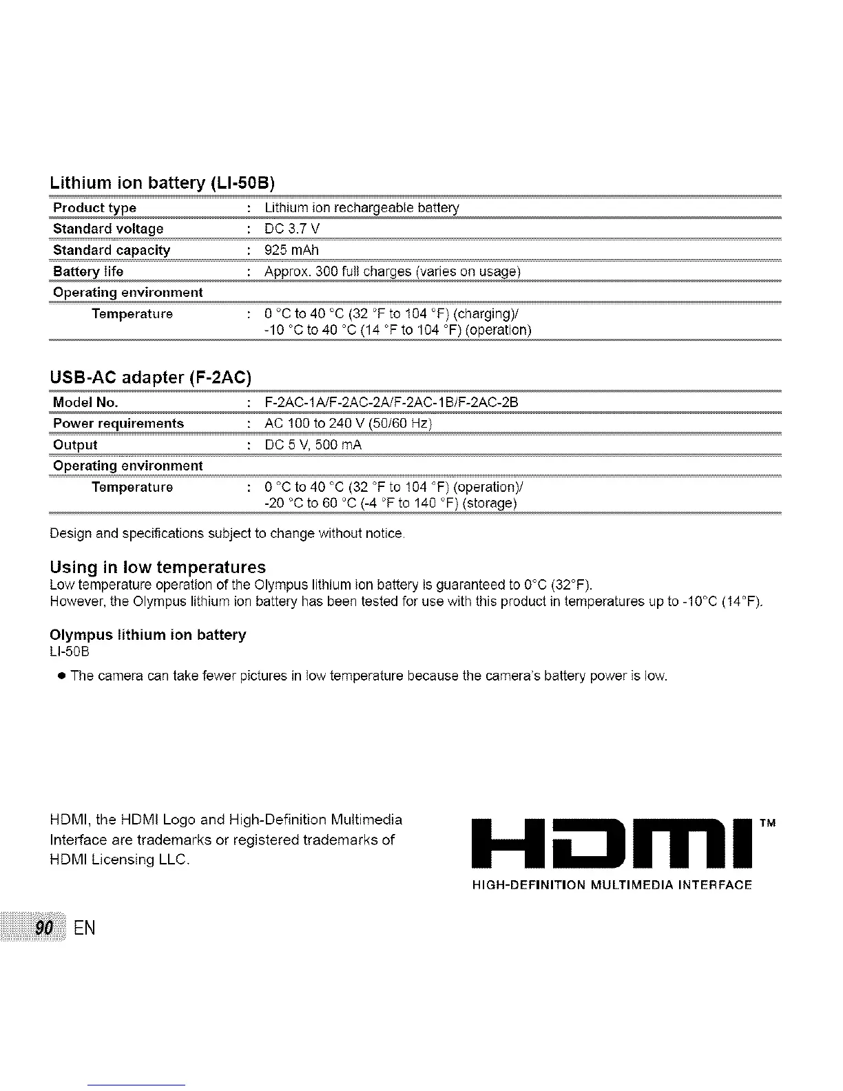 However, the Olympus lithium ion battery has been tested for use with this product in temperatures up to -10°C (14°F).
