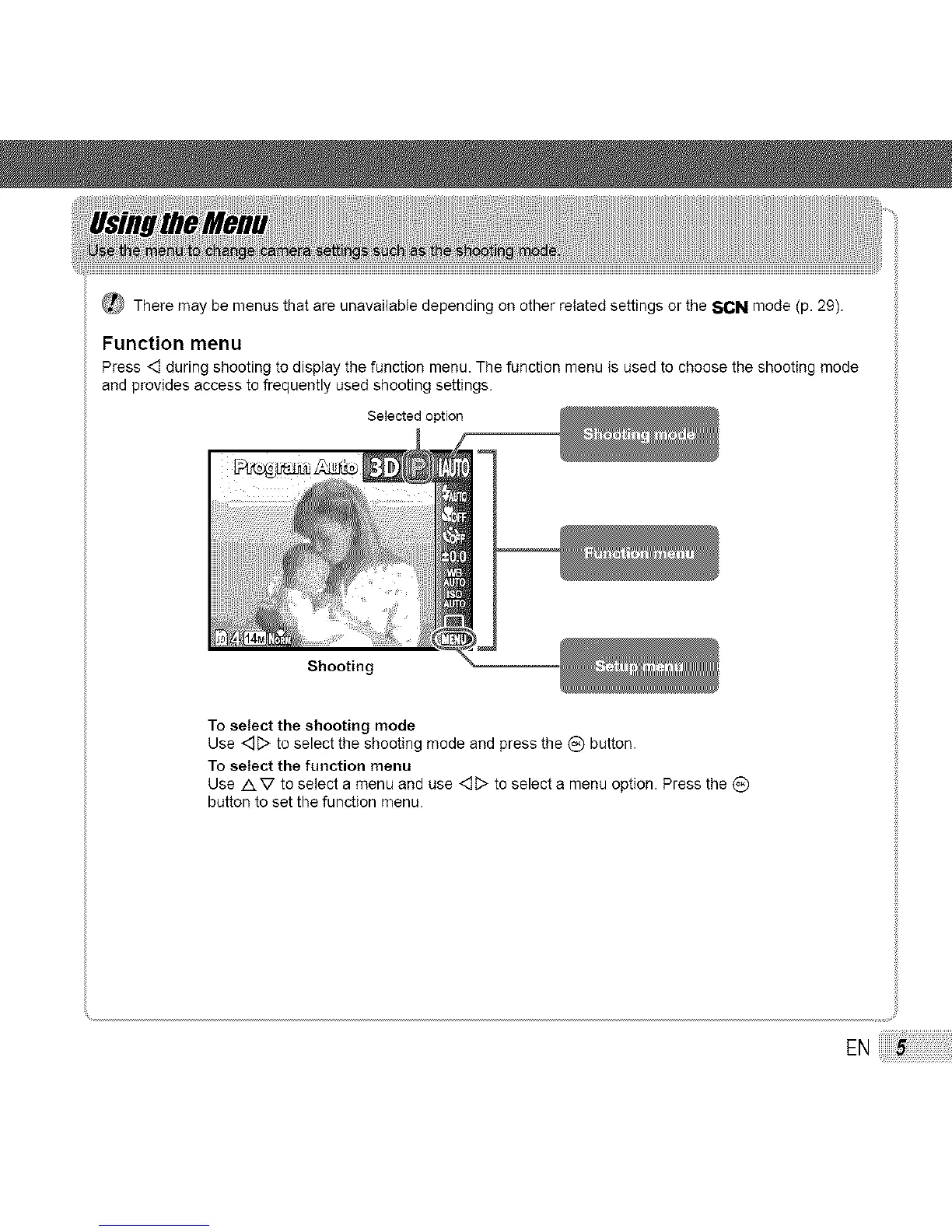 Press <] during shooting to display the function menu. The function menu is used to choose the shooting mode