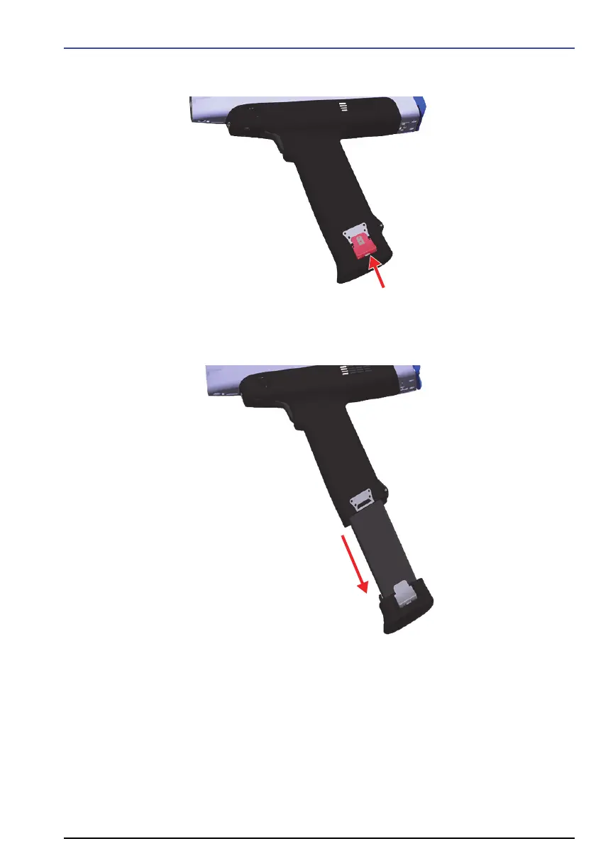 1. 抓着Va nta 分析仪的手柄,按下两个铰接式电池释放按钮。按钮位于手柄相对的两侧。