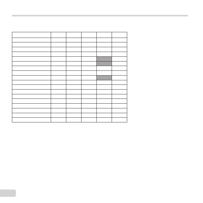 List of settings available in each shooting mode