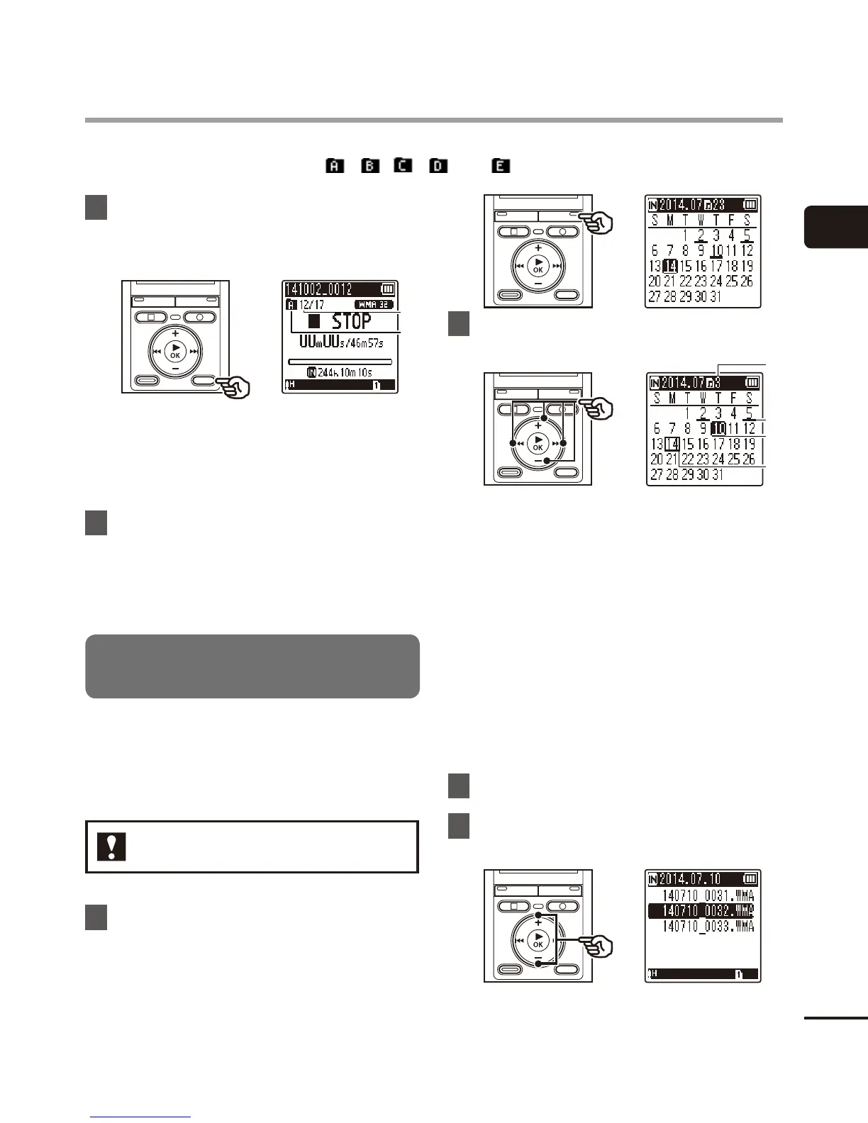 The recorder provides five folders, [ ], [ ],[ ], [ ] and [ ]. Each folder can store up to 200 files.