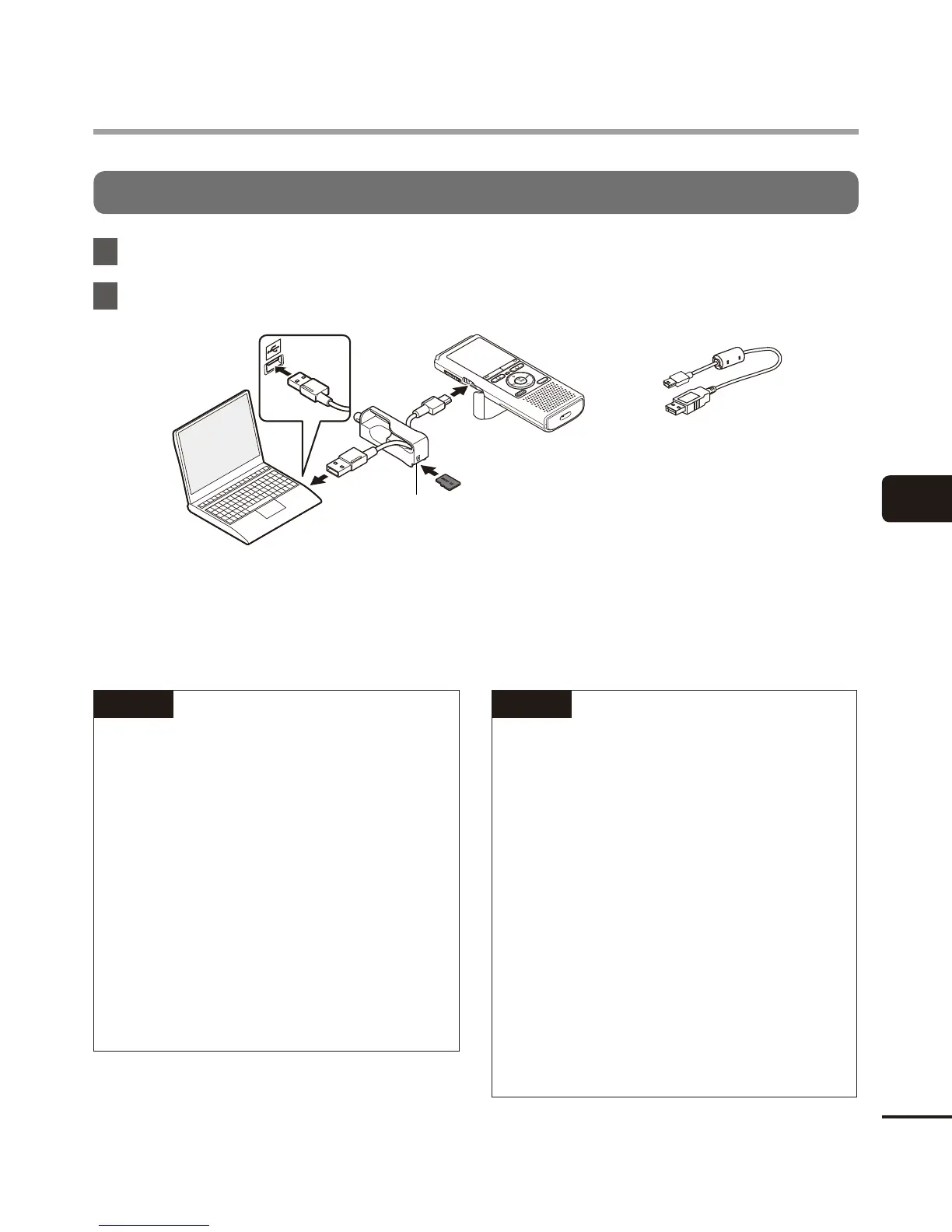 2 Check that the voice recorder is in stop mode, then connect the Portable USB cable.
