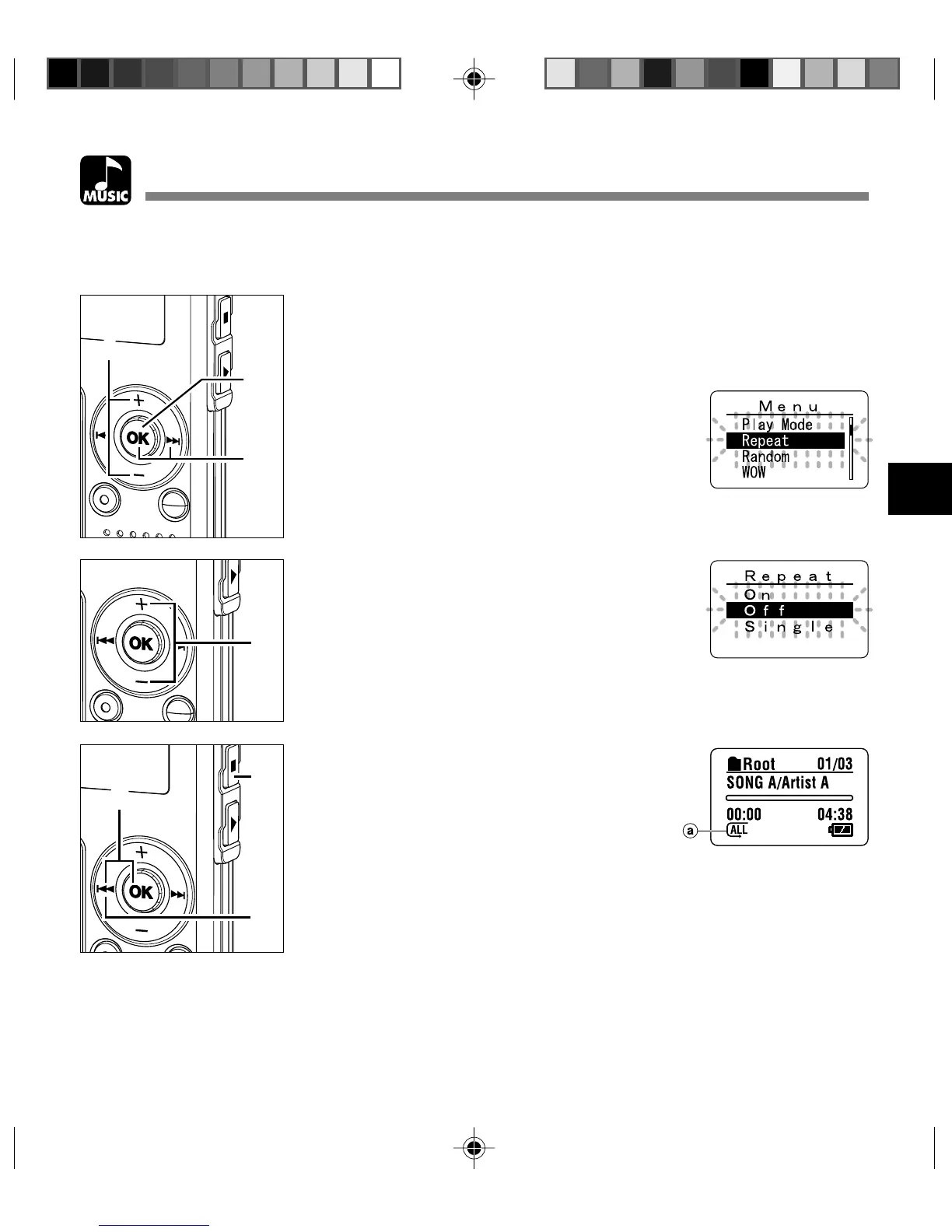 You can set the repeat playback of the music files within the range set in “Play Mode” (☞ P.58).